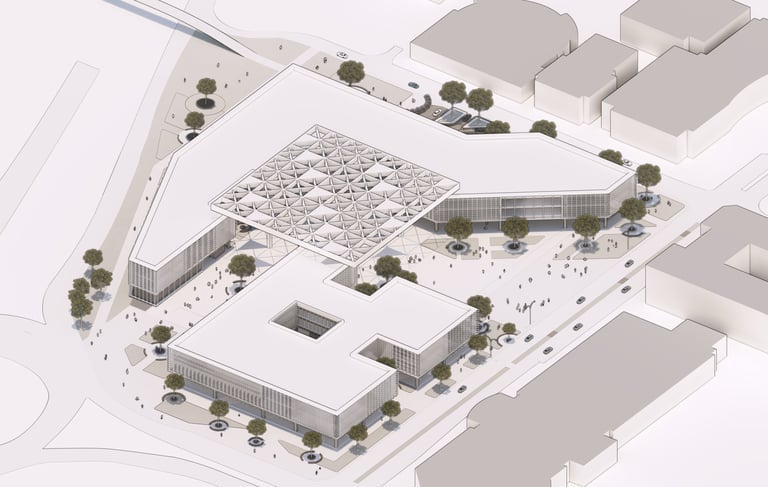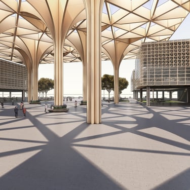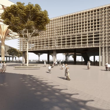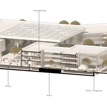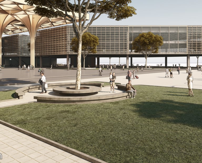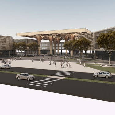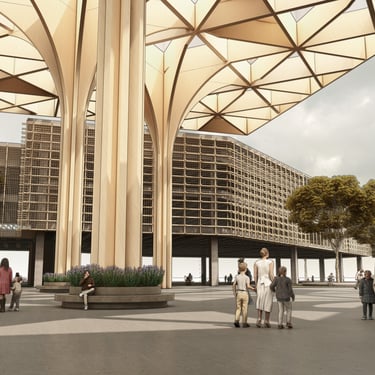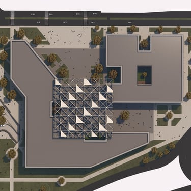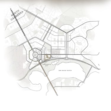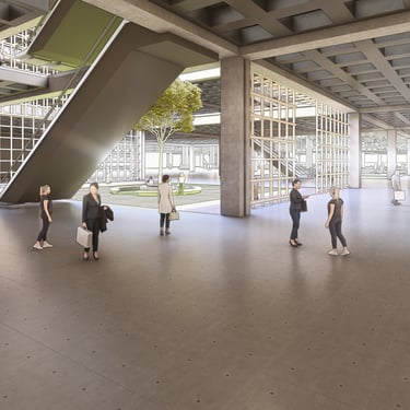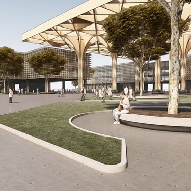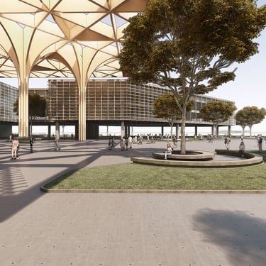 “Agora Nexus: A Harmonious Flow of Civic Life,” the project emphasizes horizontal circulation at the ground level to optimize pedestrian flow and strengthen connections between key landmarks, including City Hill, UNSW, Commonwealth Park, and future developments such as a proposed light rail. The modern agora is defined by monumental columns and expansive shaded structures, fostering an inviting, flexible environment for public gatherings and civic interaction. Drawing on classical design principles, the agora encourages social engagement, while the open layout with communal seating enhances inclusivity and unimpeded circulation.